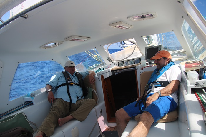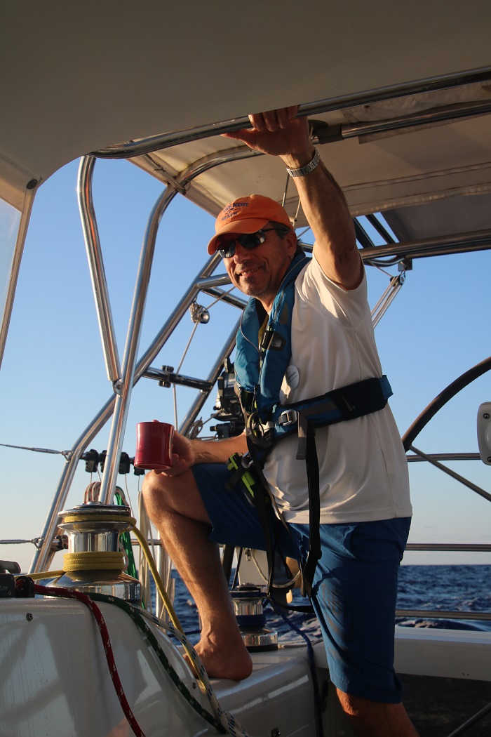 Fabulous sunsets.That changed by the minute as the sun winked out below the horizon.   Pandora’s mascot Louis enjoyed standing watch as we made our way north.   Recall that Louis joined us in St Martin with the hope of “seeing the world, Pandora style”.  Someday Louis will go to live with our granddaughter Tori when she’s old enough to hear about his adventures with YaYa and Grandpy.Pandora’s crew, Cliff and Jim during a particularly tense part of the trip.  Jim “striking a pose” with his morning coffee  Amazingly, these guys were the FIRST ever to be aboard Pandora to choose decaf.  Imagine, three sailors, including me, who don’t want high test and all aboard Pandora?  There’s probably 4 or 5 more out there but I haven’t met them.