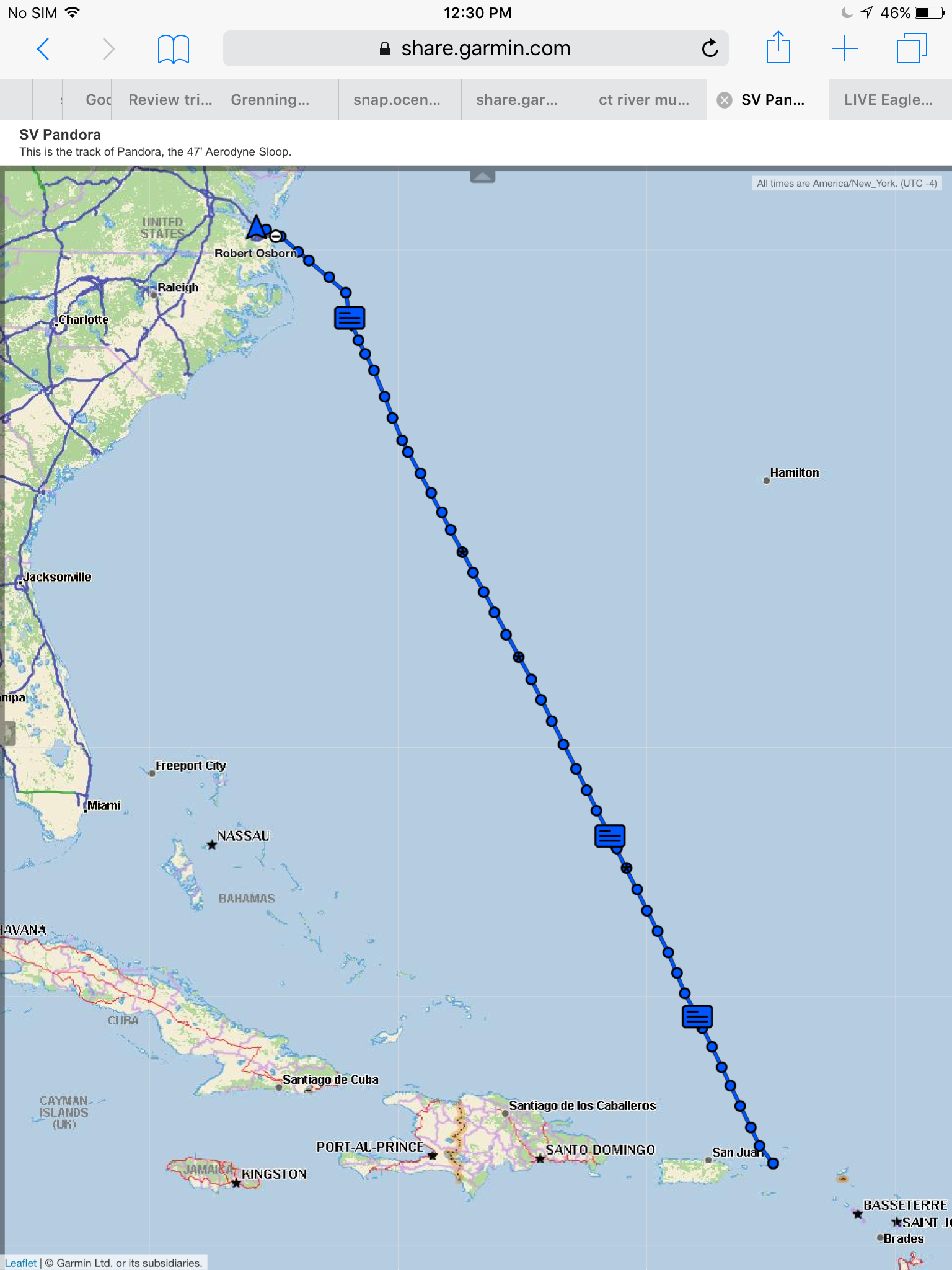 Of course, If you’ve been following on “where in the world is Pandora“, you’ve seen the course we took as we headed north.  For me, it’s endlessly entertaining to see the actual track from our 8 day voyage from Tortola to Hampton VA, a distance of about 1,200 miles.   It’s a pretty straight shot and you can even see where we were set north-east by the strong current of the gulf stream, 100 miles wide running to the NE at about 4kts.   That’s a lot of moving water. So, there you have it, Pandora’s safe and sound and her crew, none the worse for wear.  I’ll be back aboard to finish the trip north in late June.