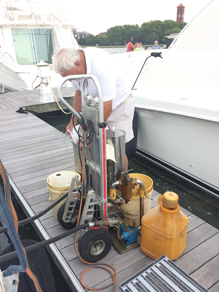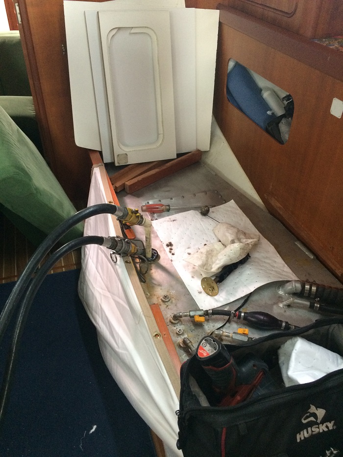 Ok, I got that out of the way so now I’ll talk a bit about water in fuel.  Nice segue, right?  Recall that when I was running from Tortola north last month, I switched fuel tanks about 500 miles from shore, and discovered that I had picked up some water along with fuel, I think, in NC.   Well, what a mess.   I had the three fuel tanks cleaned and he found several gallons of water in the offending tank and a little bit in one of the two others.  His rig for filtering the tanks was pretty neat but it did look like quite the Rube Goldberg contraption.   For those of you who are too young to know who Rube Goldberg is, here’s a link to the Official Rube Goldberg society website.  So, the hoses ran down into the cabin and into the fuel tanks via an access port. A powerful pump sucked fuel out of the tank, through a filer and squirted it back into the tank, stirring up any water and sediment that might have collected.   What the heck, go ahead and trash the cabin.  Everybody else does.So, some 6+ hours later, three clean fuel tanks.  Wasn’t that easy?