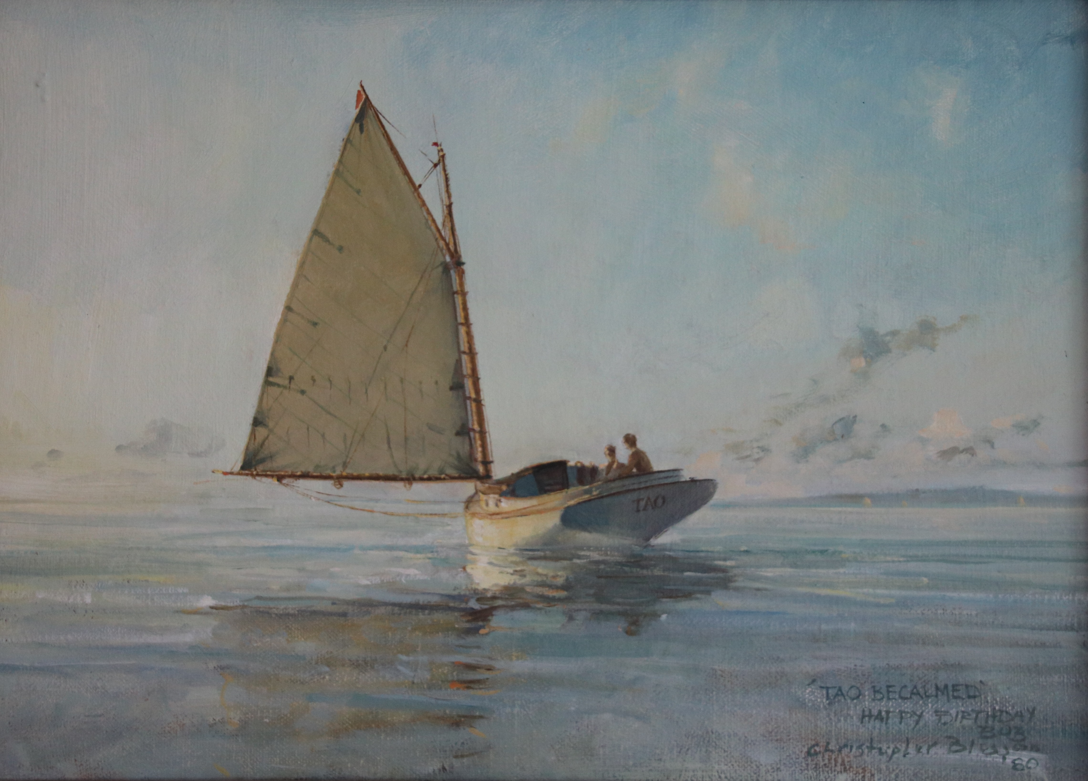 Peter Legnos, the designer and builder behind this boat built our first boat, a diminutive 20’ catboat a Mystic 20 and the first boat that Brenda and I owned, back in the late 70s. I don’t have a photo of TAO handy so a shot of a painting of her done by my friend Christopher Blossom will have to suffice.