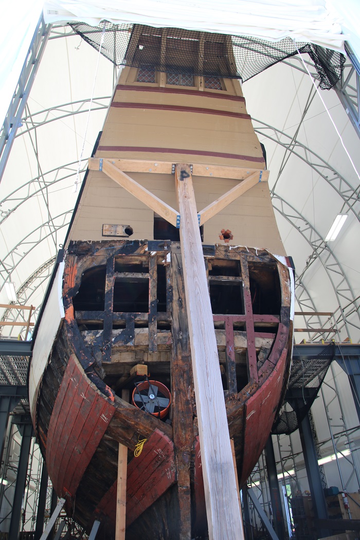 Even though they have a decidedly un-viking dodger on board, Brenda would NOT have approved and it seems clear that some of the crew look like they felt about the same way. “Lars… Are we there yet, I am frigging freezing”. “Oh, just shut up or I’ll gore you with my horned helmet”Well, I guess that I have beaten this topic to death so perhaps I’ll call it quits for now and close with a shot of the stern of the Mayflower which is being rebuilt at Mystic Seaport. Next time, when I am feeling a bit overwhelmed by all that I have to get ready aboard Pandora for next winter’s cruise in the Caribbean I’ll remember this photo and know that my to-do list could be a LOT WORSE.