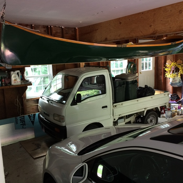 Not big you say? Can you take her on a highway? Never mind. It’s fun to drive and seems big when I maneuver her to park in the garage. Actually, she fits fine along with Brenda’s VW, our MGA, and even under our Adirondack guide boat, all in a two car garage. How convenient. How cozy. And look, there’s even room for several garbage cans. Isn’t that practical? Totally!
