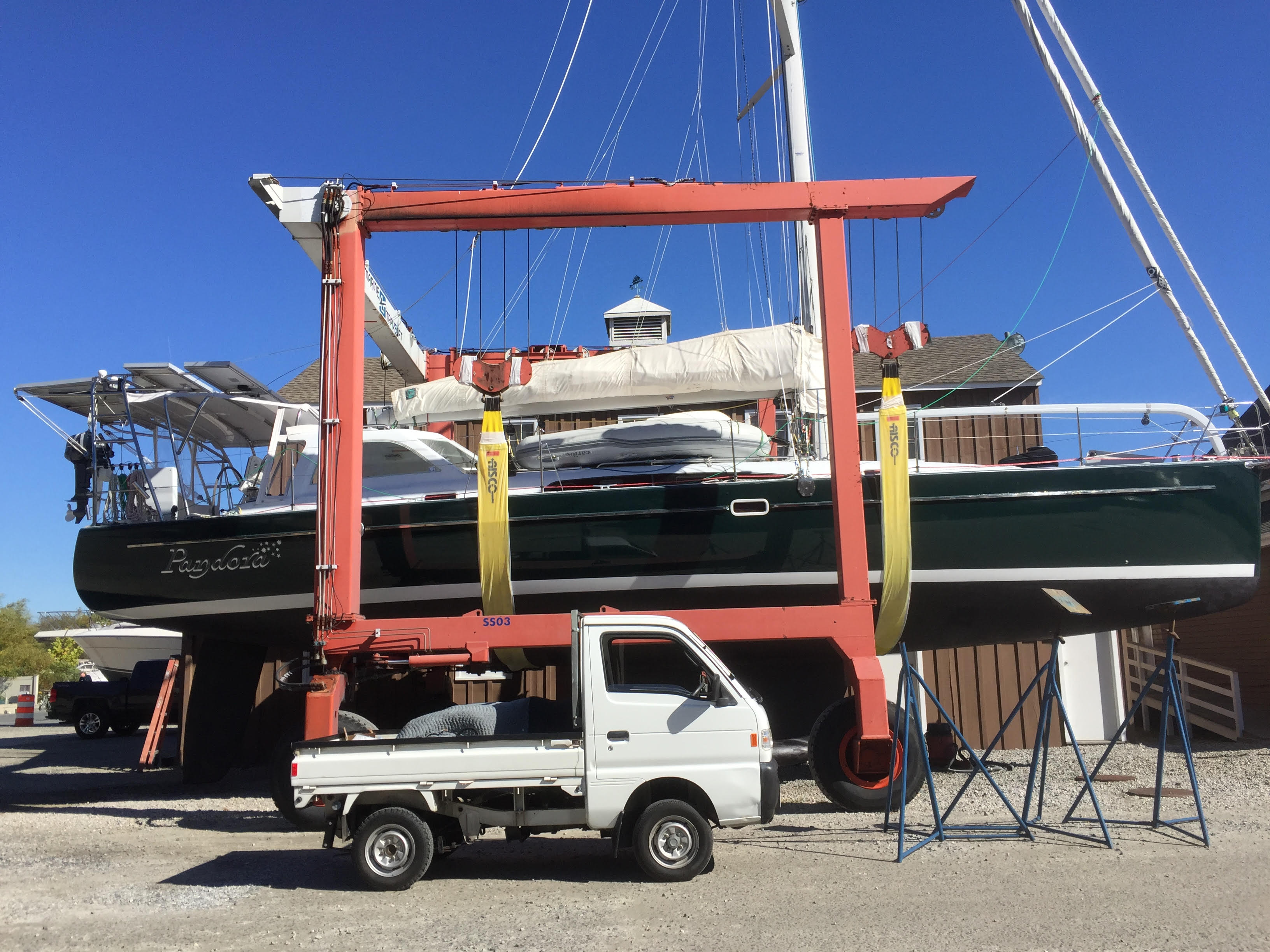 Here’s Pandora all ready to launch yesterday with her trusty little truck, mine actually, standing by to assist.  Big boat and travel lift.  Little truck. Yes?I’d love to write about all that has been done to make Pandora as safe and comfortable for our winter afloat and the voyage to Antigua but I just don’t have a spare minute before we leave this evening.  However, I do plan to outline, in nauseating detail, all of that when I get to Hampton so stay tuned.