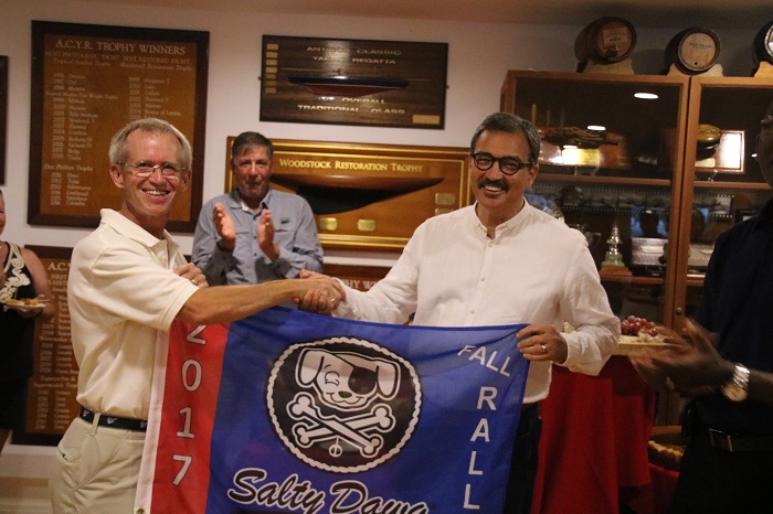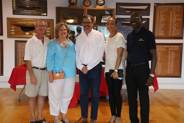 There have been quite a few events already but last night’s reception at the Antigua Yacht Club hosted by the yacht club for all of us.  Oh hand for the festivities in the clubhouse was Antigua Tourism Minister Fernandez, as well as Franklyn Braithwaite, AYC Commodore.  From left to right,  Me, Brenda, Minister Fernandez, his wife Jill and Commodore Braithwaite.  As Port Captain I had the honor of presenting a rally flag to the Minister.  Hey wait, is that Forest Gump in the background?And a rally flag and club burgee to the AYC Commodore.