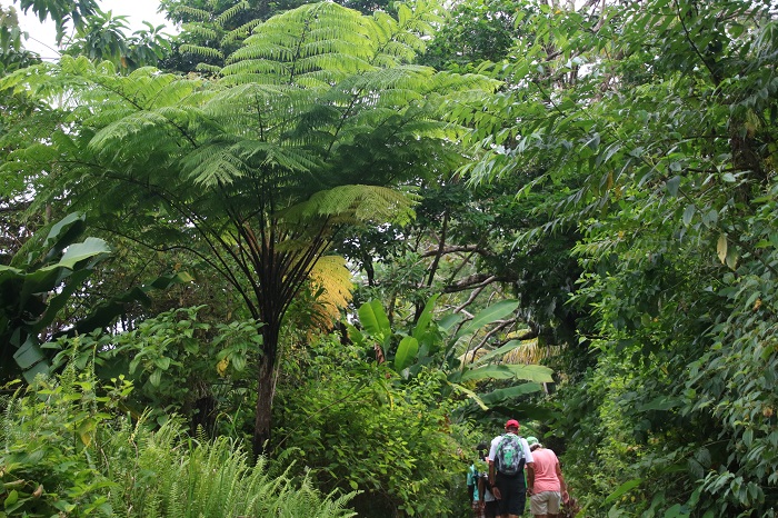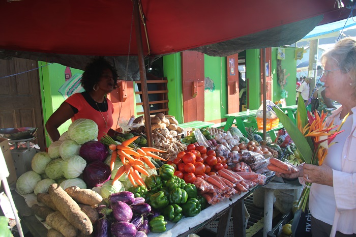Of course, we visited a beautiful waterfall. And met some wonderful local folks. like this woman in a local market wearing traditional Caribbean garb.  It’s worth noting that this market wasn’t in an area frequented by many tourists so she wasn’t dressed like this “just for show”. Unlike many of the islands further north, including the BVIs that are pretty arid, there is considerable rainfall here to support a wide variety of agriculture which makes for lots to choose from in the local markets. We enjoyed visiting Dominica and are hopeful that the forests will recover quickly.