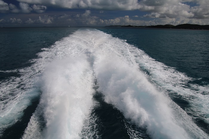 We left Pandora, at 06:45 to head to the taxi for the 20 minute ride into St John and it wasn’t until after 09:30 that the ferry was able to board it’s passengers and head out for the 90 minute run to Montserrat. The ferry was powered by water jets and to see the water jetting out behind us as we made our way at better than 20kts hinted at the power of the twin engines.