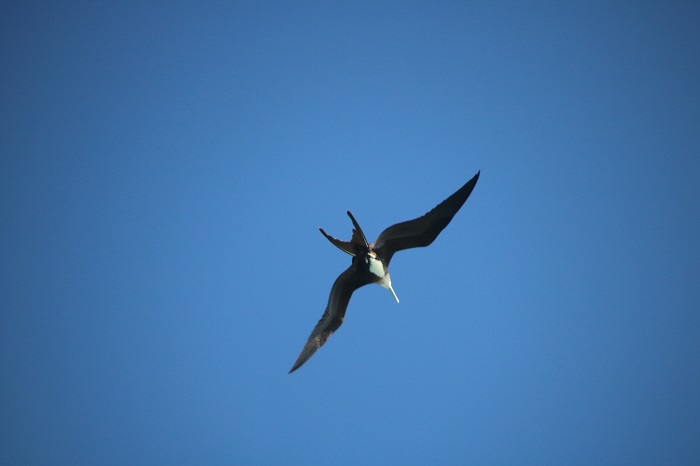 Overhead the frigate birds circled, looking for fish to catch. These birds are huge, with a wingspan of more than 6′.