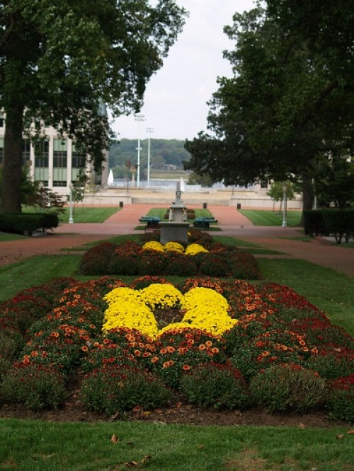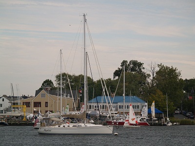 The grounds are really beautiful and there are stately buildings everywhere you look.  They say that when the Academy was designed the government was making a strong statement to England about how serious the navy was here in America.  I’d say that they made their point very clearly.  This is an imposing building and looks a lot like the college in England too.   No accident, I am told. The chapel is particularly beautiful.  It’s the large dome that shows from all over Annapolis.  Inside is awe inspiring for sure.  And, the view from the front steps is one of the best on the grounds.  However, the fall colors seemed at odds with the 80+ degree heat that we are having.  There is one consolation though that it cools down at night.  The officers live well here.  It’s interesting to note that each home is exactly the same.  No favorites here, at least not on the surface.  Well, no favorites except for the most senior officer.  His home is quite a place by any measure. Of course, Pandora is an impressive residence too if a bit smaller.  Here she is on her mooring off of the Academy wall.  Not a bad spot to be. If she’s worth showing once, how about a bit closer?  Works for me. I’ll sign off for now as someone is coming to look at my Side Band Radio today as I am still having some trouble getting good reception.   He’ll be here at 08:00 and I need to have everything cleared out so he can look at all of the components.  I’d love to get this resolved as I’d love to participate in the cruisers nets in the morning.