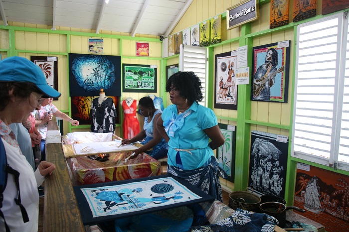 The complex patterns of color are built up by sequentially waxing various areas of fabric and then dying in progressively darker colors. In the end, the wax is taken out of the fabric and it’s sewn into various items for sale.