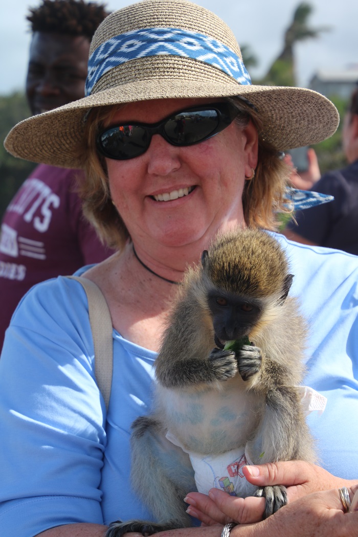 Of course where their are tourists, there are “entrepreneurs” and in this case, a guy with a monkey. Before she could say “I hope that monkey doesn’t poop on me”, he climbed all over Brenda for a photo moment and a bit of fruit. She, Brenda that is, was a very good sport.