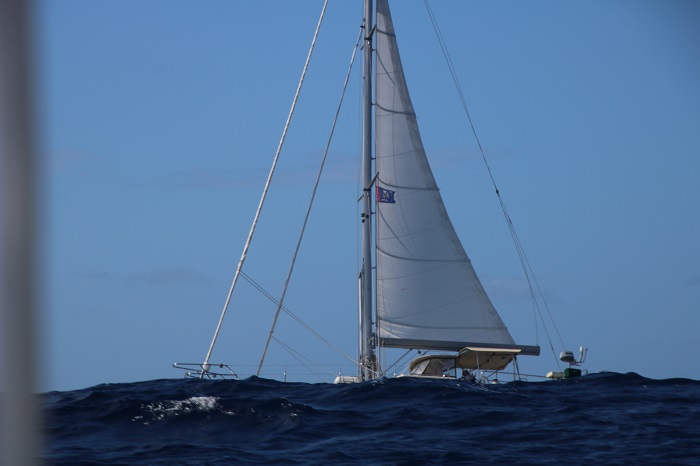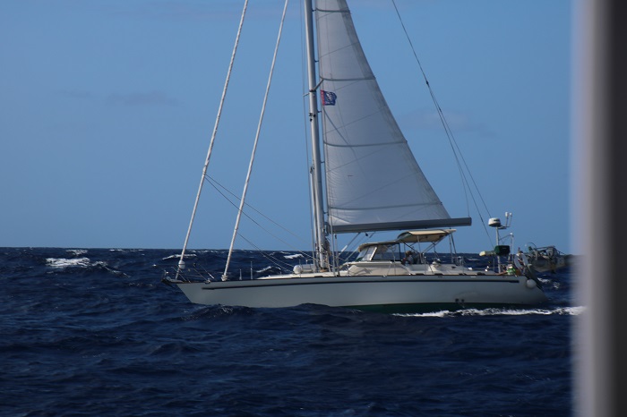 It was quite a rough day. It’s always frustrating to try and take photos of waves as it never seems to really show what it was like. Perhaps these two shots of our friends on Oasis, who sailed with us make the point. Here they are close by us as we made our way to Guadeloupe. Looks pretty normal?