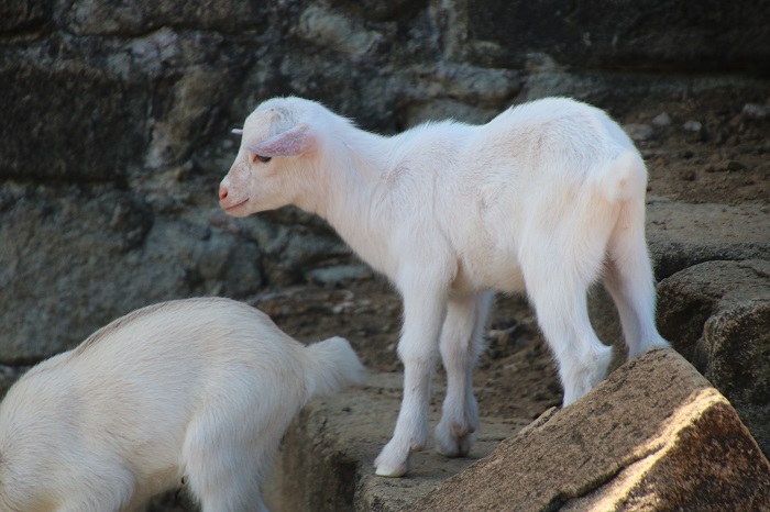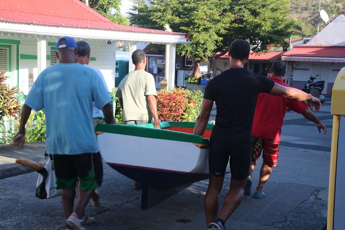 Another bit of local fauna, a kestrel, I think. And, of course, goats.  Always lots of goats.  In this case, baby goats, goatettes, or goatees.   Hmm…Down in the main town there was a great little parade.   Drums and all sorts of percussion.  All the marchers were probably nearly deaf after the event was over.  Brenda and I loved this little household garden.  I also enjoyed watching these guys “launch” a boat, freshly painted.  They walked briskly along, stopping every 100′ or so for a break.   “Stop, stop Francois, time for a cigarette break.  We are French after all.”  Looks heavy. Along the way (we rented a golf cart for the day) we stopped at a “beach bar” for lunch.   How about tuna ceviche and wine at a lowly beach bar?  Only in a French Island!  Bon appetite!  Indeed.