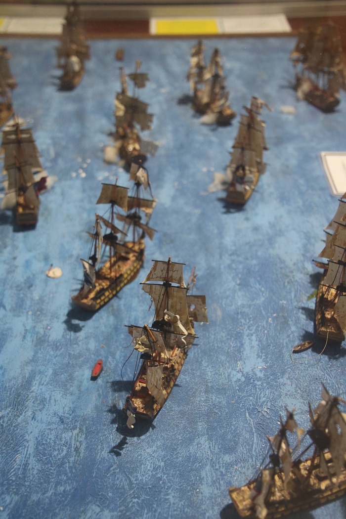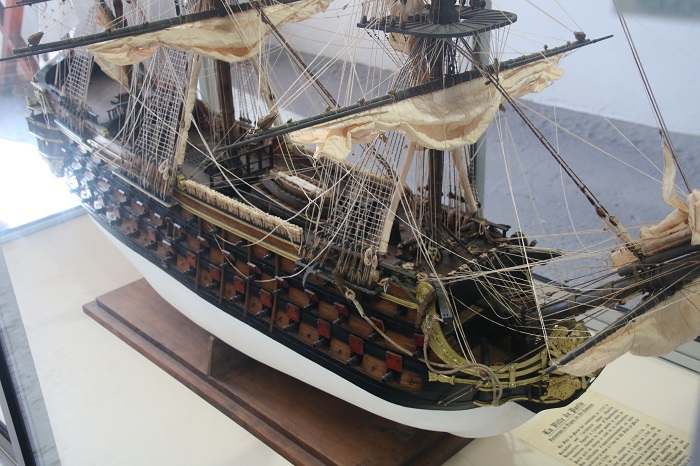 “battle of the Saintes”.   This diorama showed all the ships that fought.  This is only a detail shot but it’s sufficient to say that there were a lot of ships banging away at each other.    The museum has a number of very nice large scale models including this one of the 90 gun flagship, The Formidable, launched in England in 1777 after a ten year build.  Interestingly, it wasn’t dismantled until the early 1800s.   That’s a long career for a wooden fighting ship.  The model is nearly 5′ long.   Impressive.