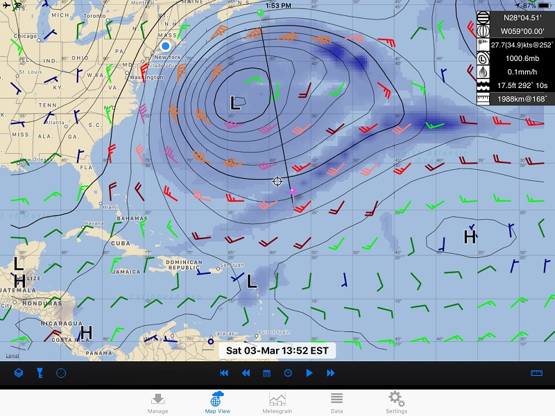And, speaking of water, yesterday was really windy as a massive winter storm churned through the North Atlantic.  Amazingly, the storm, literally thousands of miles from the southern Caribbean, will make passage, even as far away as South America, unpleasant with a large ocean swell.  Yes, the period will be long, 12-15 seconds, but it will be large, never the less.   Note the ruler crossing the storm, it’s nearly 2,000 km long.  That’s a huge storm.  That matters to us as we will only have about 6 weeks till Brenda flies out of St. Lucia in mid April and back to the US so we don’t have a lot of time to hang around Martinique waiting for better conditions to head further south.
