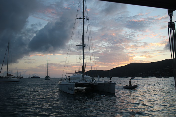 It was jolting to leave the cold and grey North East and arrive in humid Martinique a few hours later.  Who knew that you could fly direct to Martinique from Providence RI?  As we took off we flew over Narragansett bay, our local cruising grounds for so many years. Not a green leaf in sight and every boat was covered in white plastic. No wonder it’s so dreary in the winter with this thick cloud cover. As we winged our way south at over 500kts the sunset was beautiful with the contrasting deep blue of the stratosphere. Oh yeah, almost forgot.  We had such a terrific time visiting our family.   Our granddaughter is getting big and somehow just keeps getting cuter and cuter. And she loves books.  “Daddy, daddy, hold me on top of your head while I read my favorite.”Perhaps I’ll sign off now with a shot of the sunset last night aboard Pandora accompanied by some great cheese, a fresh baguette and of course, a nice bottle of French wine.    No, not the best shot but, trust me, it was a beautiful evening.  I am worried that the good times may come to a screeching halt if I can’t find a way to put the Pandora’s “potty chronicles” behind me.  Wish me luck.