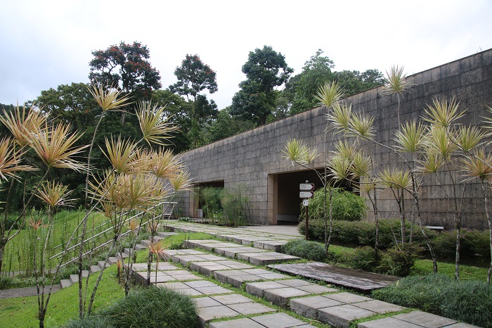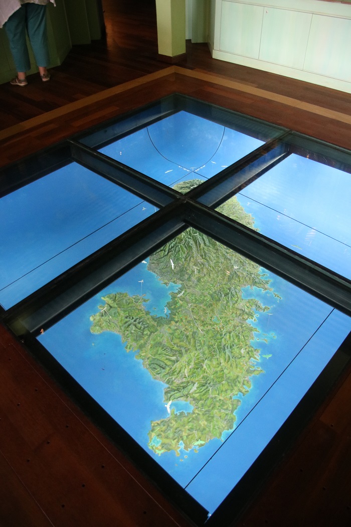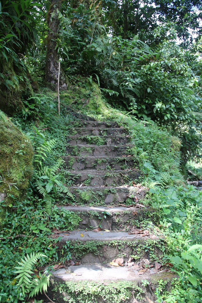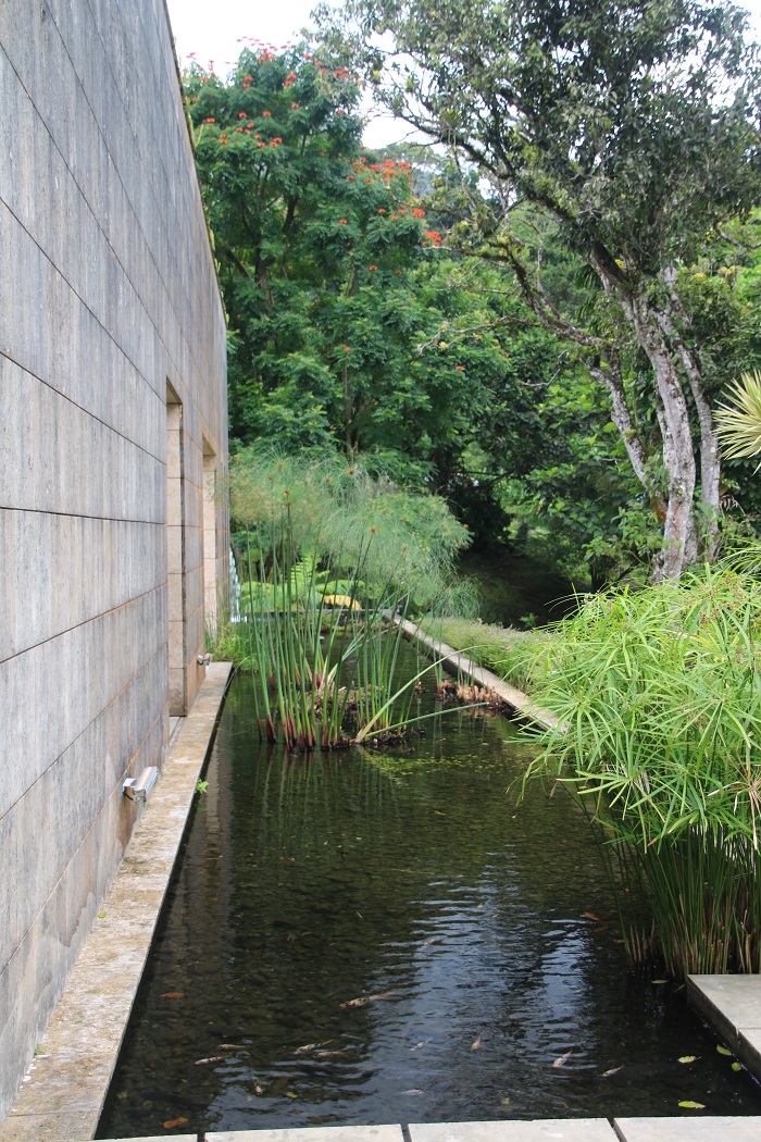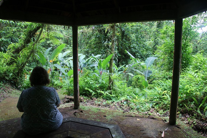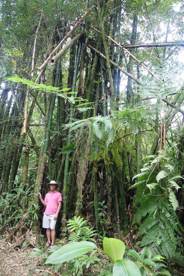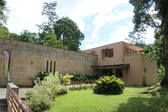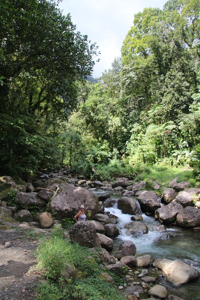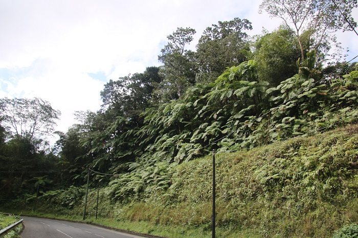 As we made our way north along the winding highway we made our way through mountain ridges and valleys, with constant switchbacks as we went up into the hills, higher and higher in elevation.  The temperatures decreased noticeably as the elevation increased and the vegetation lining the roads became thicker and thicker.It was great fun driving along, white knuckles and all, making what seemed like impossible turns as the road made it’s way through the mountainous terrain.   Suddenly, around yet another sharp bend in the road, we came upon a quick moving stream.  It was beautiful.  The waters rushing down from the mountains was crystal clear and wonderfully cool.  A bit farther up from the road was a family lounging in the river. One bather had impossibly long hair, reaching to the ground.  I’ll bet that he has wicked split ends.   I wonder if his hair was as long as our granddaughter Tori when he was born. At most any point along the way Pelee was in view, towering over the landscape, shrouded in fog.  As we approached the summit by road the view, well, there wasn’t a view.   I guess that’s why they call it a “cloud forest”. Along the way we happened upon Domaine d’Emeraude, part of the Martinique National Park System.   Good luck with the site, it appears to be available only in French.   I sure wish I had payed attention to French in High school.  It’s a part of the Martinique national park system.  The reception building was very contemporary. On site was an interpretative museum of the natural history of the island.  Unfortunately, like their website, all the information was in French but well done.  A beautiful setting.  Reflecting pools lined the front of the building.  As y0u entered the building you were greeted by a beautifully displayed 3D map of the island, displayed under glass on the floor.  It was a bit unnerving to stand on the glass.  The manicured grounds surrounding the main buildings were beautifully presented. Beyond the organized parts of the preserve were miles of trails, every inch paved with cement slabs.  I was told that the bags of concrete were carried in by hand and cast in place.   In spite of the near constant moisture the rough surface of the path offered sure footing.   I can not imagine the number of workers that it took to lay all of the pathways beginning in the 1970s, I believe. Some areas along the pathways offered dramatic views.