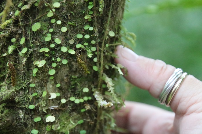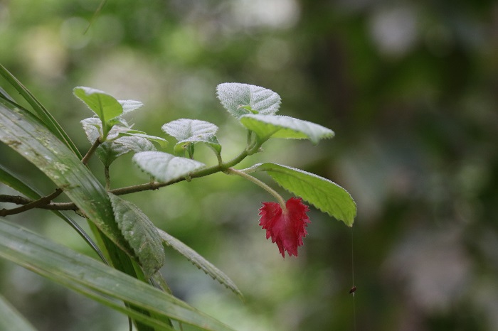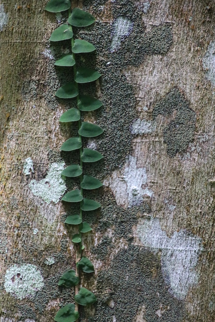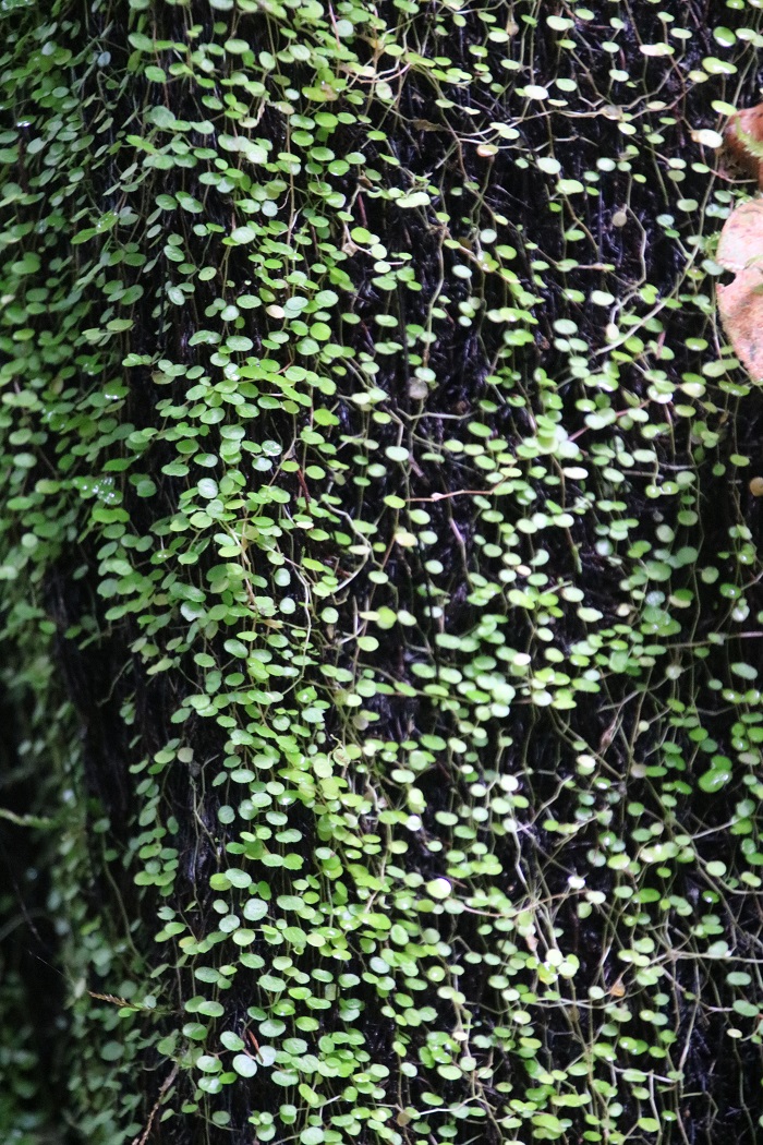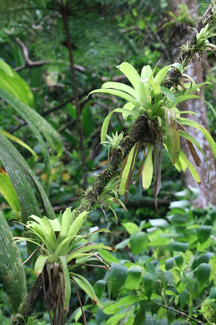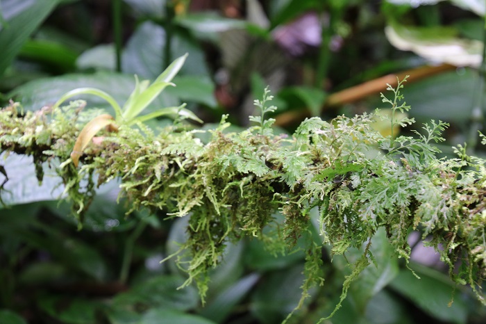 This one is in the lily family. Everything from the towering trees to the smallest twigs were a riot of growth.  This heavily laden branch was only about 1/2″ thick. Bromeliads were everywhere. Not your typical Chiquita banana.  As we walked through the forest there were a number of rough shelters where we could sit and enjoy the solitude and, I expect, escape the rain when necessary.  Tiny leaves carpeting the trunk of a tree.  The leaves are so small that you’d easily miss them if you weren’t paying close attention.Dainty leaves so fragile it’s hard to believe that they can compete for the available light.