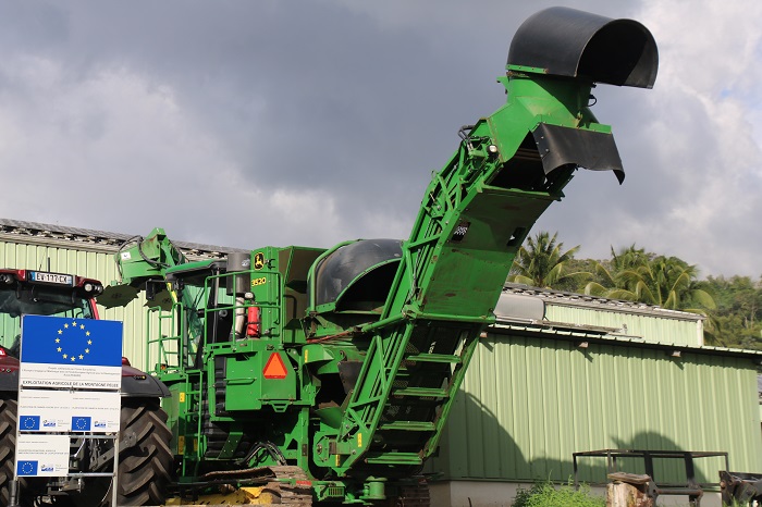 This is the business end of the combine. The boom at the top employs two massive circular blades to cut the cane and feed it into the steel “maws”. inside the machine the cane is chopped up and separated from the leaves that are spit out the back to help rebuild the soil. This is not a machine to be trifled with.