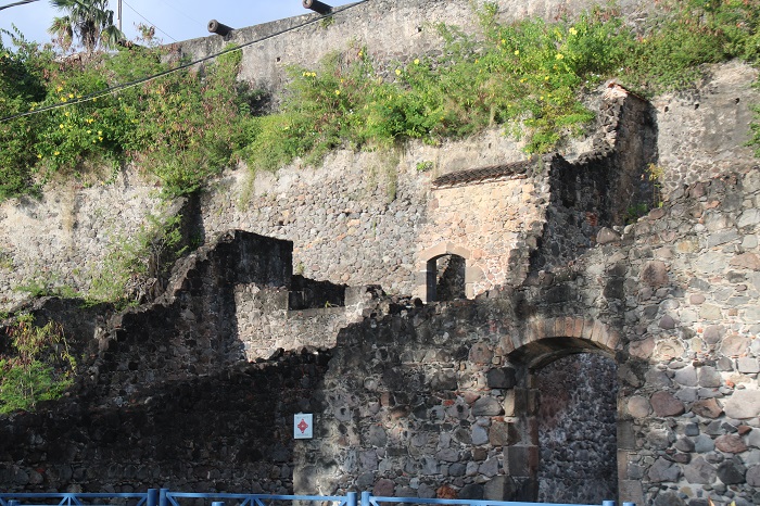 There are still remnants of the aqueducts that moved water to the factory. As Martinique is a very wet country, there is usually plenty of water and this spillway was designed to carry away excess water beyond what the factory needed to power the crushing machinery. The day we were there plenty of water was flowing over the spillway and onto the parking lot.