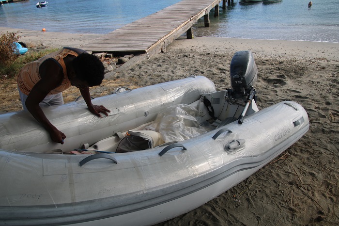 We were told that there are some excellent craftsman here on the island and had planned to have some work done while we visited.  In particular, we hoped to have canvas covers or “chaps” made for our dink.  The blazing tropical sun is pretty tough on everything and an inflatable dink is particularly susceptible to decay.  Having one of the better brands like Caribe, ours, does help as they are made with high quality Hypalon but even the best materials will only hold up just so long with near year round use.
