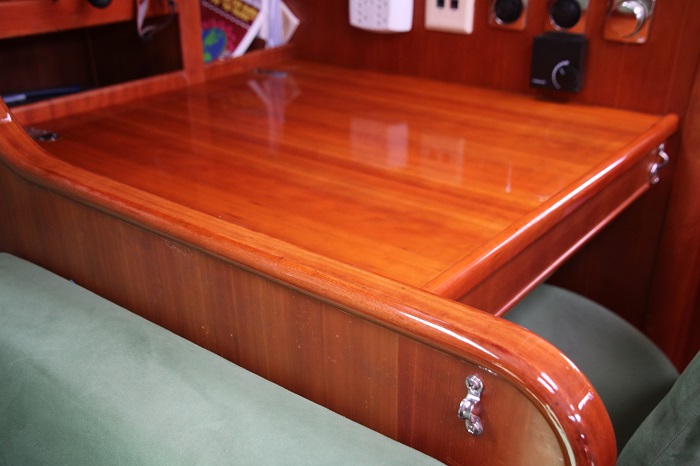 Bob, it looks like Winfield did a great job on the varnish. His recommendation of gloss on the trim pieces is consistent with what Hinckley recommends. Funny, we are having the companion-way on our boat revarnished for the first time this spring as well. However, I suspect that Winfield is a lot more reasonable. To protect the navtable, you may wish to use a plastic mat. Fair winds and safe travels Bob.