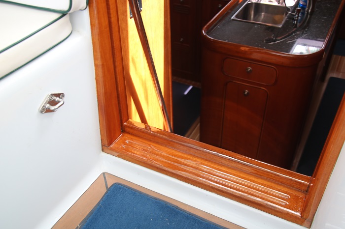 We loved the varnish work that Winfield did for us in Bequia.    Some of the finish below was getting a bit scruffy so we had him update some of the trim in the forward head, galley, chart table and companionway.  It turned out to be more disruptive than we had expected with work breaks for Good Friday and Easter, but the finished product is beautiful.  Winfield suggested that we go with bright varnish for the trim and other areas below as it’s a lot more durable than semigloss.   Good call.