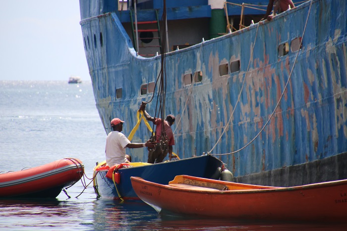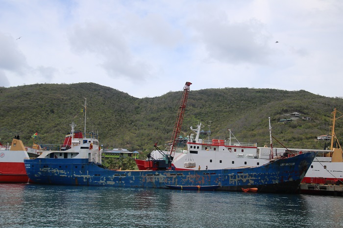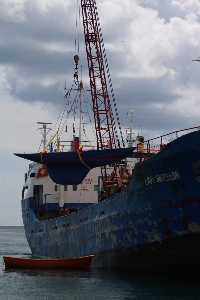 Just before we left Bequia, and after the regatta was over, there was a mass exodus from the harbor of many of the boats that had come there to participate.  Most of the transient boats left under their own bottom but this one, a Shield I think, was lying along side a tramp freighter.  I wonder where she was headed?A little while later they fitted her with lifting straps. And up she went.  And speaking of going places, I have mentioned in past posts that my plan is to run Pandora north for the summer and do the Salty Dawg rally to Antigua again this November.