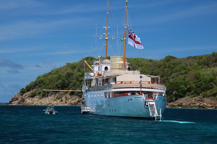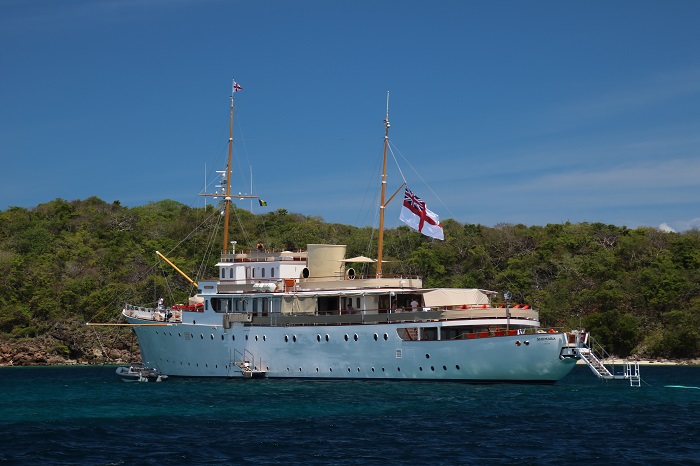 It looks beautiful.  Trim that looks too nice to touch The chart table is so shiny I am afraid to use it.  And, now a shiny compaionway that was looking very scruffy. Winfield clearly takes pride in his work.  No surprises and we are very happy with how it turned out.  The bad news, now the rest of the boat looks rough by comparison.  Well, there’s always next year. And, speaking of varnish.   I expect that this beautiful grand lady, Shemara, circa 1938, has plenty.  At over 200′ long she surely has plenty to keep her crew hopping.   Love the classic canoe stern.  How’s that for a swim platform?The refit consumed one million hours of labor over several years.  That’s a big number and it doesn’t even count the massive amount of “stuff” that went into the job.  She’s still a real throwback to a different era, but under her classic skin she is totally modern.  Check out this article, which I recall seeing a while back, to learn more about this magnificent yacht.  She’s got some pretty exotic systems aboard.