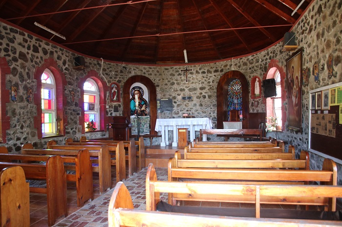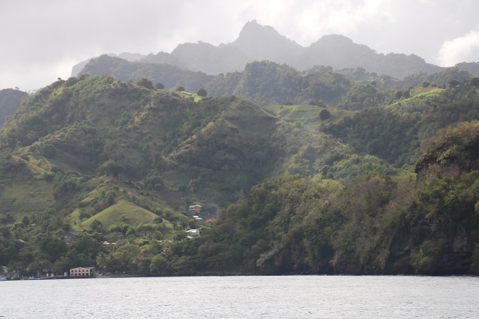 Iguanas guarding their turf. This guy stuck his head up near Pandora as we were weighing anchor as if to say “see yah!”We also visited nearby Mayreau, an island that I had never heard of, ,like many in the Greandines, until we decided to head the short distance there from the Tobago Cays.    It’s a tiny island with lovely brightly painted homes on the steep hillside. A Catholic church occupies the highest point on the island.Charming. The view of the Cays from the back of the church was fabulous.
