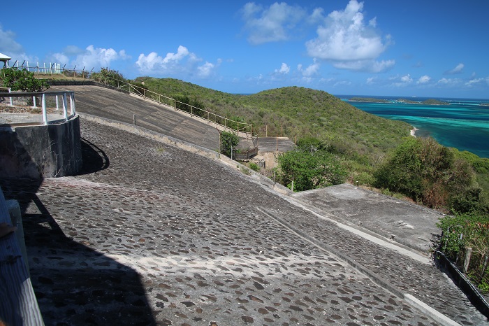 And south toward Union Island and Carriacou beckon for next season.  While nearby mountainous St Vincent gets lots of rain, only a few miles south, Mayreau is very arid.  The locals work hard to collect water in cisterns, this one behind the church is the largest I have seen.  The runoff collects at the bottom of the half acre stone and cement catchment area. In this arid climate cactus was everywhere.  These flowers were very showy and fist size.  Nothing says “I am not for lunch” like a cactus. Of course, what’s a post without a view of Pandora in the harbor?  We were anchored with “buddy-boat” Roxy, home to our friends Lynn and Mark.    They plan to summer in Trinidad and head to the western Caribbean next winter.  We hope to see them again soon.