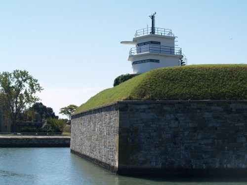 On Friday morning Brenda and I were lucky to have our new friend Kate lend us a car so we could explore the area so we visited Fort Monroe which was a few miles from Hampton Harbor where Pandora was anchored.   This fort has been there since the Revolution and is still actively in use, although now more for residential purposes.  The fort is quite large and even has a mote surrounding it.   I expect that the viewing tower is a newer addition.  I can’t see guys with muskets shooting from the top of that.