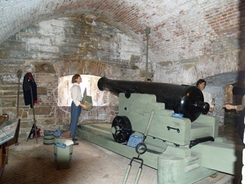 In New England we are accustomed to seeing signs stating that “George Washington slept here” but at Fort Monroe we saw this house where Abraham Lincoln slept and did something important.  I can’t recall what it was but the sign said that it was more than a nap.  There was a really interesting museum inside of the main fortification, surrounding the grounds.   I am not sure what it would be called but the entire fort was ringed with a massive dirt “wall” that included living quarters inside.   Part of this had been made into museum with samples of what the quarters looked like when the fort was actively protecting Hampton Roads.  Love these guys standing around in this exhibit.  I think that they might be taxidermy soldiers from the Revolutionary period.    Their hair looked at least that old.  All of this old stuff stands in stark contrast to the massive naval presence in Newport News which we passed yesterday on our way south.