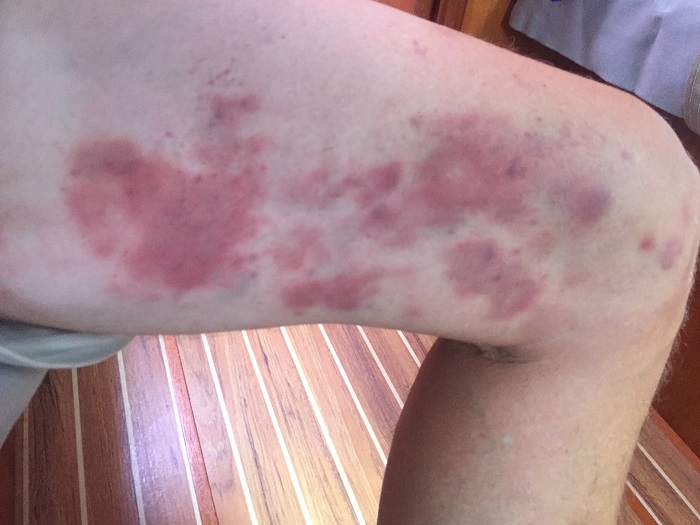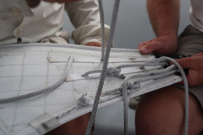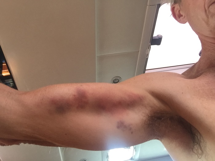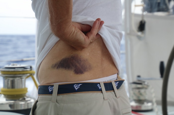 As you recall, the headboard, the piece that holds up the top of the mainsail, broke, disconnecting from the top of the sail.   The headboard shot to the top of the mast and the sail, to the deck.  Messy.We pulled the top of the sail through the front of the dodger so we could work on it under cover. After a lot of discussion on what the best fix would be, we decided to drill holes in the sail and thread lengths of super-strong Dynema rope to support it.  Good thing I have a large tool and spare parts selection aboard. Several hours, nine holes and a bunch of knots later…All done.  Not beautiful but plenty strong. The “better side”. George and Bob put the sail back into the mast slides as I was still feeling a bit shaky from my run up the mast. And, speaking of my time “aloft”, I had a few bruises to prove that it was a rough ride.  This one was particularly tender.  Not sure what I banged into but I thought that it was pretty impressive. The inside of both thighs from clinging to the mast.   “Thanks for sharing Bob! Disgusting, really!”Ok, if you insist.  The insides of both arms.  I was really clutching the mast with all my might.   Superman I’m not, but I was clutching the mast “super hard”. As rough as it was the day I went up the mast, a few days later, not so rough.  Once you get north of Bermuda the winds are all over the place if there is any wind at all. We ended up motoring something like 100 hours and yet still managed to sail between 800 and 900 miles and sometimes at near double digit speeds for days at a time.  I wrote about one of our best days of sailing, early in our trip in this post.
