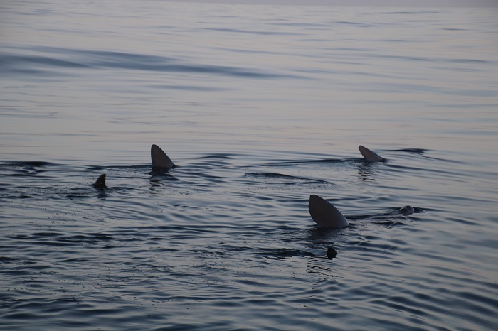 As much as I hate motoring day after day, the calm seas that come along with no wind do make for good conditions to spot sea life.  We saw a small pod of humpback whales and also many of these sharks, Basking sharks I think.    The fin, tail and “nose” of the shark are very distinctive as they slowly swim along with their enormous mouth agape.   These sharks run in the 15-25′ long, the second largest shark species.  In spite of their enormous size, their primary food is plankton, tiny invertebrates.   We saw dozens as we approached the continental shelf about 100 miles south of Montauk. One of them slowly swam toward Pandora until he/she was only about 2′ from our hull and suddenly realized how close we were.  And with a violent splash, turned away.  They really look primeval. All and all, we had a good run and in spite of 100 hours of motoring, we still made very good time, nearly 180 miles per day for 1,600 miles, over the bottom.