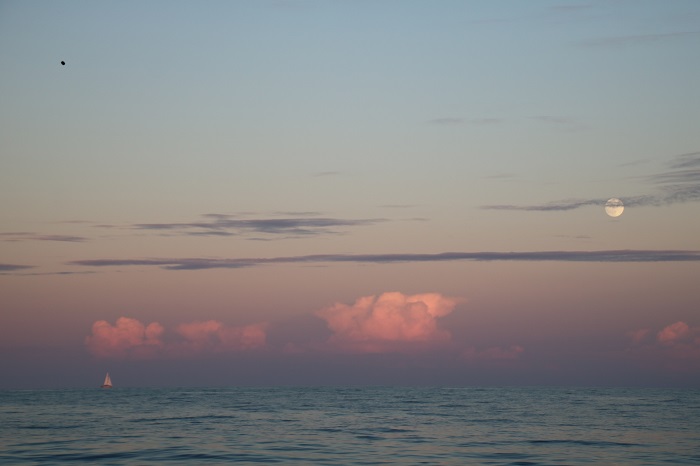 To see a full moon rise at dusk with a single sail on the horizon…The growing glow on the eastern horizon as a raceboat crosses our bow.
