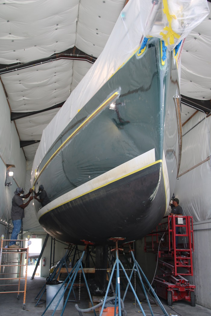 So, here we are, deciding on the color for yet another paint job, her third since being launched in 2007.  The shed pre-arrival.  Pretty big space.  Not so big now.  She fills it right up.  So, here she is being prepped and now is a good time to think of what’s next.  That’s where you come in.  Ok, so the plan is to nix the dark color and go to something lighter, perhaps a LOT lighter.  Easier to keep looking clean and a lot cooler.   Here’s Pandora in her current color scheme. The shop doing the refit offered to modify the photo of Pandora to show different Alexseal color options as well as boot tops and cove stripes for comparison.   As a note, we are going with that brand of paint as opposed to Alwgrip, as it’s a bit softer paint and somewhat more resilient to dings as well as easier to repair.  I understand that many of the really big yachts, that are always being touched up, have gone to Alexseal.