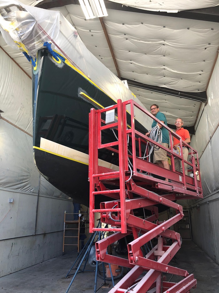 Pandora’s job was a bit complicated because of a wooden rub rail that protects the hull. Unfortunately, it was never properly prepared when the boat was built and therefore it has had a habit of peeling badly over the years. Cooley has taken some special preparation steps that we hope will minimize the problem going forward but only time will tell. This is me and Andrew checking out the “bad news” regarding the toe-rail before she was prepped for paint. Notice that his smile is bigger than mine? Just why is that, exactly?