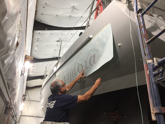 I think it looks just awesome. On the starboard side he switched the stars to the other end of the logo so that they would trail aft in both cases.   My artist friend Chris had that idea and I think it was quite inspired. The process of actually applying the “sticker” was simpler than I would have expected.   Mike sprayed a solution of water, alcohol and a bit of soap to the surface so that he could lift the vinyl if he got a wrinkle.  No problem though, it went on perfectly, the first time. Nice work Mike.