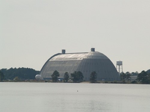 I almost forgot to put this photo of a blimp hanger in. We passed a very large Coast Guard station on our way our of Elizabeth City a few days ago. This is a REALLY BIG building. BIG doesn’t begin to describe it, actually. I expect that it was built for dirigibles and those were really huge. Hanging in the sky several thousand feet above the base was a blimp, or more of a balloon on a long wire connected to a big spool on the ground. You can see one, the white dot to the left of the hanger, on the ground in this photo. I don’t know what it was for, perhaps some sort of a “coast guard thing”. Guarding the coast is what they do, right?
