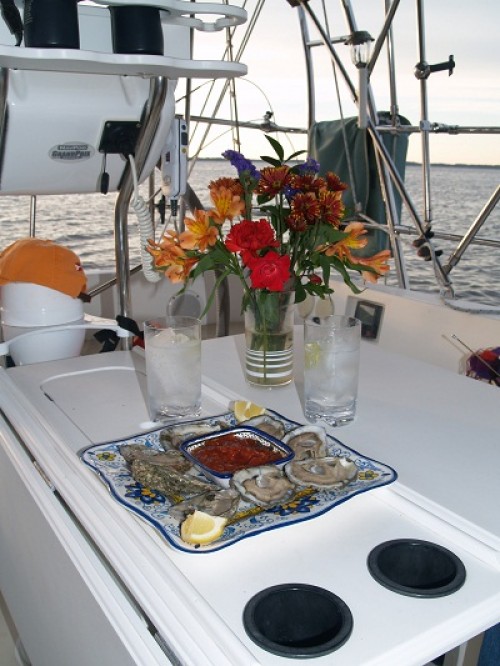 It’s Friday morning and we are underway, having stopped last night in a lovely little harbor about 25 miles north of Oriental NC where we are headed. In Elizabeth city we went to a fish market and bought a peck of oysters. You can’t buy a dozen oysters there, it seems. The options are a bushel, half bushel and a peck. I have heard of a peck of pickled peppers but never one of oysters. So how much is a peck of oysters. Let me tell you, it’s a lot, between 15-20 lbs. That’s a lot of oysters. Luckily, I am getting pretty good at opening them. We have had about 1.5 dozen oysters on the half shell two nights in a row and there are plenty left. So, how about raw oysters with Hendricks gin and tonics? It’s as good as it sounds. Totally…