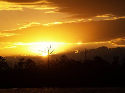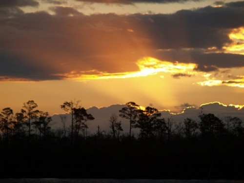 Two nights ago we were anchored in a small creek off of the Alligator River, a really desolate place if there ever was one. We were the only boat in the harbor, actually more like bay, a really shallow one. After the sun went down it was incredibly dark. Actually, with the exception of a loan green channel marker in the distance and a cell tower blinking red, it was totally dark. After twilight we were treated to a star show complete with a very dramatic milky way overhead. It was beautiful. Having said that, it was also a bit creepy to be in such a desolate place. A fishing boat wreck pokeing above the water near by didn’t help the mood. There weren’t any homes on the bay which was several miles across with the exception of some hunting shacks and duck blinds that were not occupied. Oddly, we had pretty good cell coverage due to a highway in the distance. Glad that we have a cell phone booster on the top of the mast.