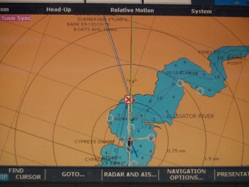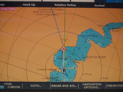 As we have headed south over the last few days we found ourselves going through a number of canals and back out into broader bodies of water. This shot of the plotter is a good example of what we saw on the charts. The ICW is a series of canals that connect more open bodies of water. Unlike the Dismal Swamp Canal, which was about 50′ wide, the Alligator Canal and others are closer to 100′ wide, plenty wide for two boats to pass comfortably. Actually, there are very few boats headed north but some powerboats do pass me from time to time.