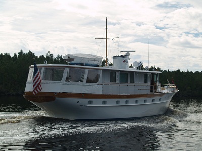 Here’s a particularly nice one that has passed me twice, yesterday and today. It seems that he stopped for the night and didn’t get going till after us today. The yacht Bernadette, a Trumpy, is also from Newport RI like Pandora.