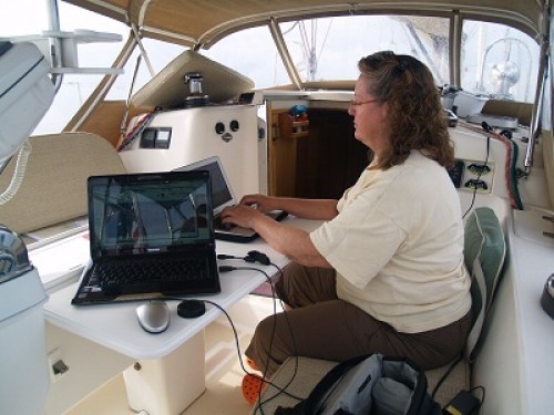 It’s been several days since I have last posted because cell coverage has been very spotty and we have been doing long days, usually dropping the hook around sunset when it’s time for a drink and not time to begin typing. When it’s calm on the water, and there is no wind (much of the time, it would seem) we work on our blogs here in the cockpit. Here’s Brenda pecking away about an hour outside of Oriental.