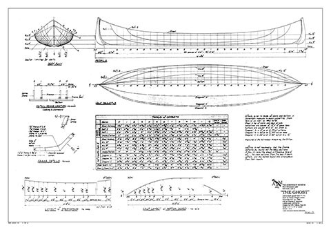 Plans for the boat, which I purchased from the museum, are now available from, oddly, Mystic Seaport. The 16′ boat has beautiful lines and with her 8′ overlapping oars, is a dream to row. It is said that a traditional guide boat is the fastest rowing boat you can find without a sliding seat. The boat Ghost itself and museum are located on Blue Mountain Lake. It’s a really great place to visit and has examples of many boats that plied the waters of the many lakes that dot the area.