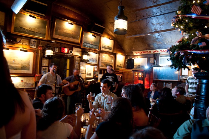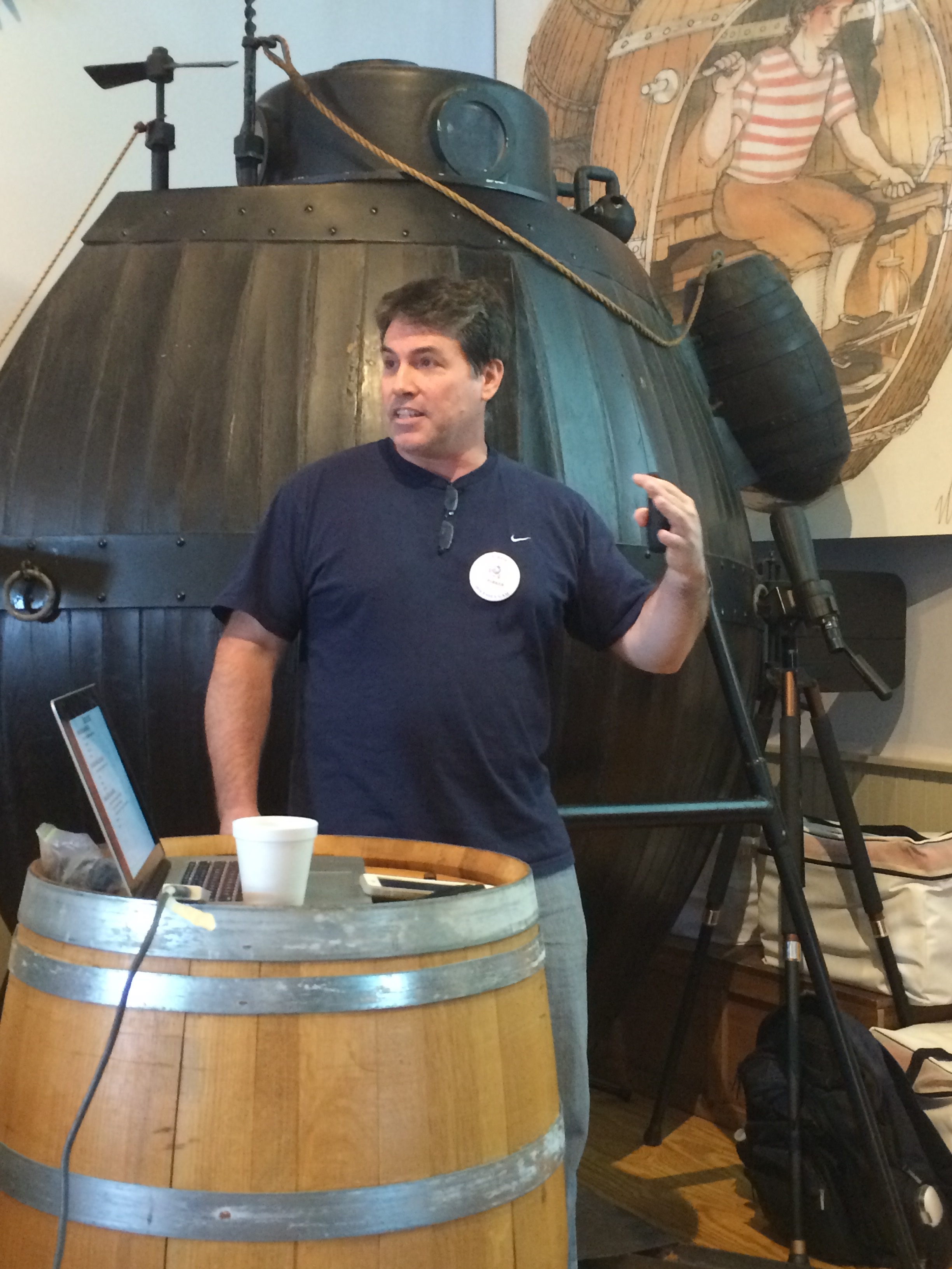 There’s plenty to do in Essex, after hours.  A particularly popular spot is the bar in the Griswold Inn, known locally as simply, The Gris.  It’s one of the oldest,  or perhaps the oldest, pubs in the country, operating continuously since 1776.My favorite event, held every Monday night at the Gris, is sea chanteys performed by the group the Jovial Crew.  They always pack the house with a very colorful mix of locals and visitors.  If you join in the rowdy fun, you’ll see  folks wearing everything from foul weather gear, to suits and even an occasional kilt, complete with waxed mustache.   Trust me, it’s way more crowded and interesting than this shot suggests, and totally worth it. And, let’s not forget the Essex Yacht Club, where the event will be held, with Pandora conveniently out in front in this shot.  The agenda is coming along nicely and will include a program on weather routing by Chris Parker of Marine Weather Center, who’s flying up from FL to speak to us.  He will talk about changes in weather forecasting and weather routing as well as some information about passages to the Caribbean.   Here’s Chris at a past event when he spoke at the museum.   Yes, that’s a reproduction of a really early submarine, the Turtle.  It lives at the CT River Museum. We’ll also have talks about cruising in Maine, the Bahamas and the Caribbean.  All with a bent toward blue water sailing.