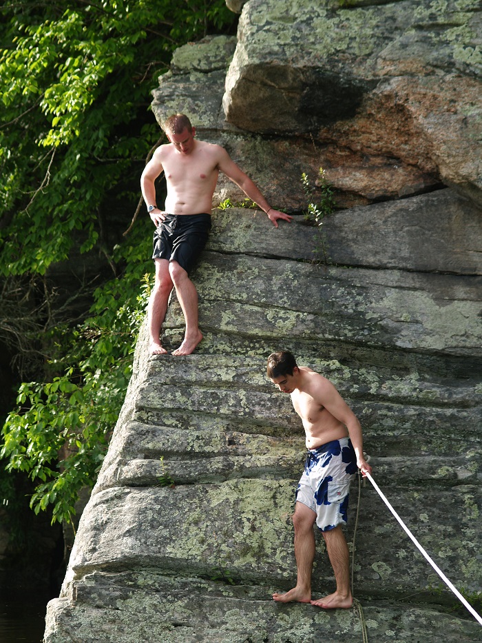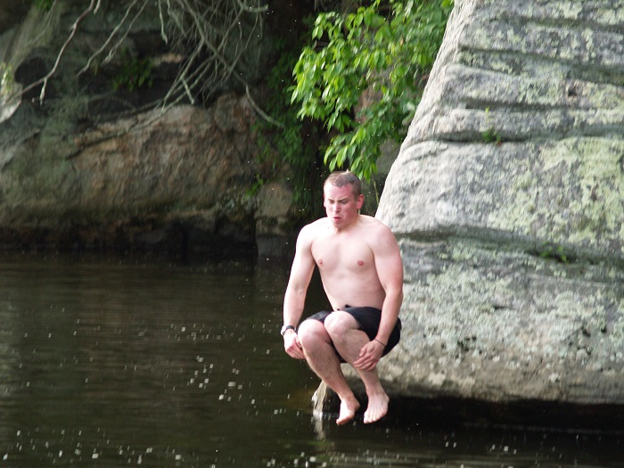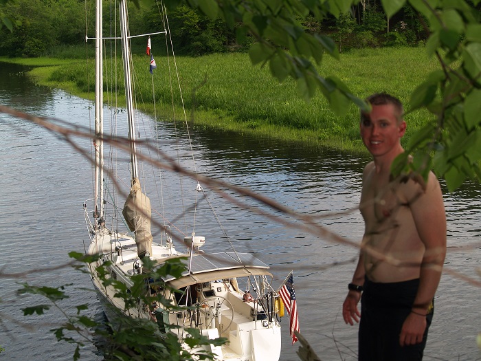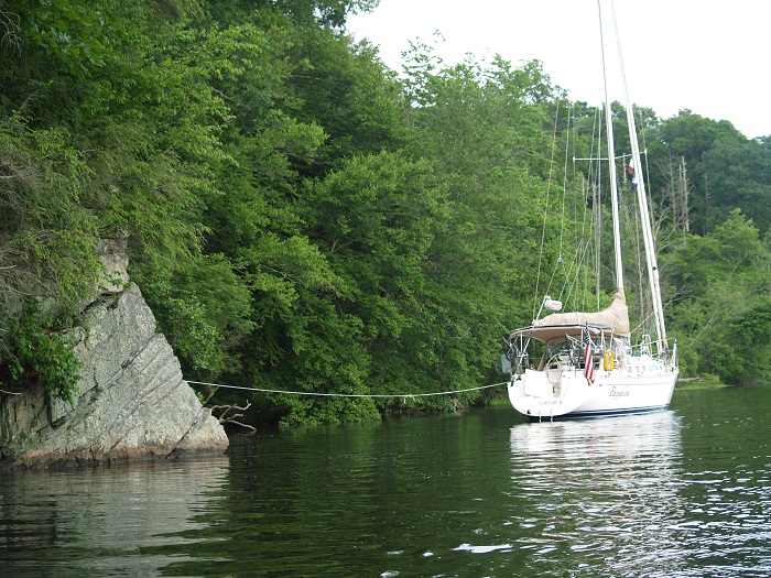 I don’t seem to have any shots of the harbor, that I can find at least, but this shot taken by my friend Liz shows the Onrust, a reproduction of Adrian Block’s boat, the one that he cruised the area with back in the “olden days”.  I expect that the members of the RWYC would remind you that Block was late in the game, nearly 400 years after the first buildings of the castle where there clubhouse is located was first built,  Anyway, here’s the Onrust on the river just outside of Hamburg cove.  The river is very scenic.  Just a bit farther up the river is Selden Creek, a really narrow and beautiful, cut off of the river.  It can be tough to get over the bar at the entrance but once but once you are inside, it’s plenty deep and stunning.  You can anchor fore and aft if you tie up to a spot on the bank.  There’s an iron ring cemented into a cliff on the bank.  This was our first Pandora, a SAGA 43 tied up there, way back in 2007.As tempting as it may be to climb up the rock and jump into the water, don’t do it as it’s private property.  Years ago, our son Rob broke the rules.  Don’t tell anyone. He and a friend jumped off of the “private” rock. What goes up, must come down.