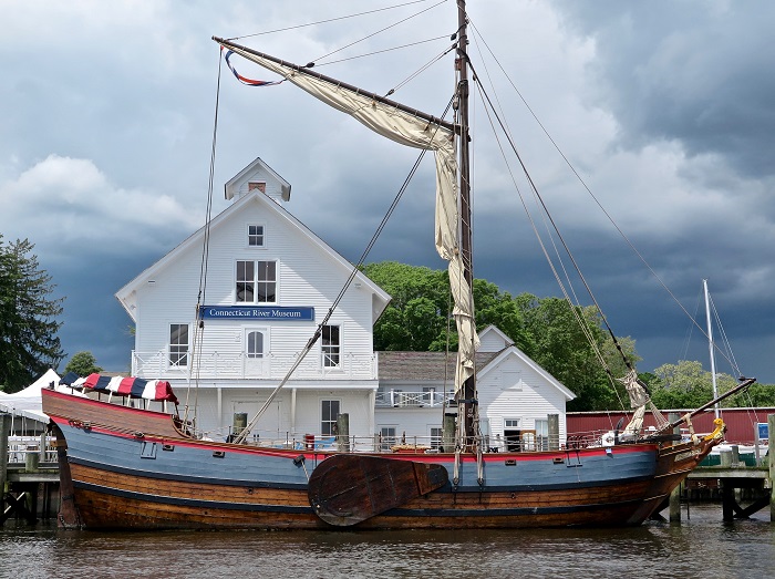 Then off for the one mile run to the Essex Yacht Club and the village of Essex, the home to the CT River Museum ,where the Onrust is berthed these days.  She’s available for cruises on the river through the CT River Museum, also a great place to visit.   I wrote about her in this post when she first arrived in the area.  She’s beautifully built and worth seeing. Essex Harbor is quite large and while there are lots of moorings for rent, there is also plenty of room to anchor on the far side of the river.   This shot, from the air, is compliments of the CT River Museum. It’s a beautiful harbor, especially in the early morning.  Fresh water here too.