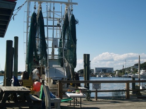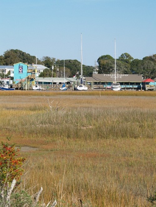 It’s Wednesday afternoon and we are on a dock in historic Southport NC. When we got here today I couldn’t find a place to anchor in spite of the guidebook saying that there was room for at least one boat in the little harbor. I did try to anchor but couldn’t make the anchor bite securely in the very soft mud. Alas, on the side of the Fishy, Fishy Restaurant, there was a phone number above some docks on the back of the place that were labeled “for patrons”. Me? I could be a patron and decided to call. So, the deal is that if we eat at Fishy, Fishy (that’s just so fun to say…Fishy, Fishy) we could stay overnight for $25. Sold!!! I asked what the depth at the slip was and he said 7′ at low water. Double sold!