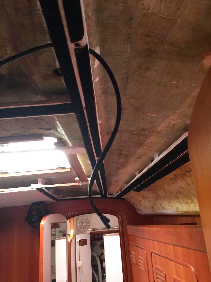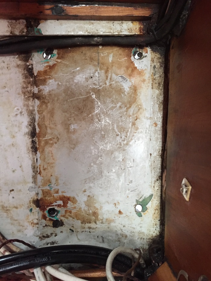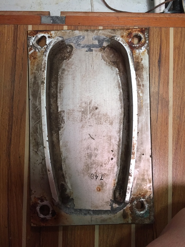 Now that I was finally able to get the mast step out of the boat, I am now in a good position to put it back with new bolts.  After so many hours of grinding it doesn’t look like much, just a bare area of fiberglass.On Wednesday I will take the step to to a welder to have the old holes filled.  After that, I’ll drill new holes adjacent to the old bolts that have been cut flush with the step.  Even though the remains of the old bolts are still in place, the rigger says that this is a perfectly fine approach as the bulk of the pressure is downward and only a small amount of shear force.  I’ll be sure to install the new bolts with some sort of release agent or caulking like Life Seal, which is what the rigger recommends if I want the step to be removable in the future.  Additionally, I’ll spray a thick lubricant/sealer like Microlube on the heads to keep them from becoming corroded.  Frankly, I doubt that I will own Pandora when it’s time to deal with corroded bolts again.